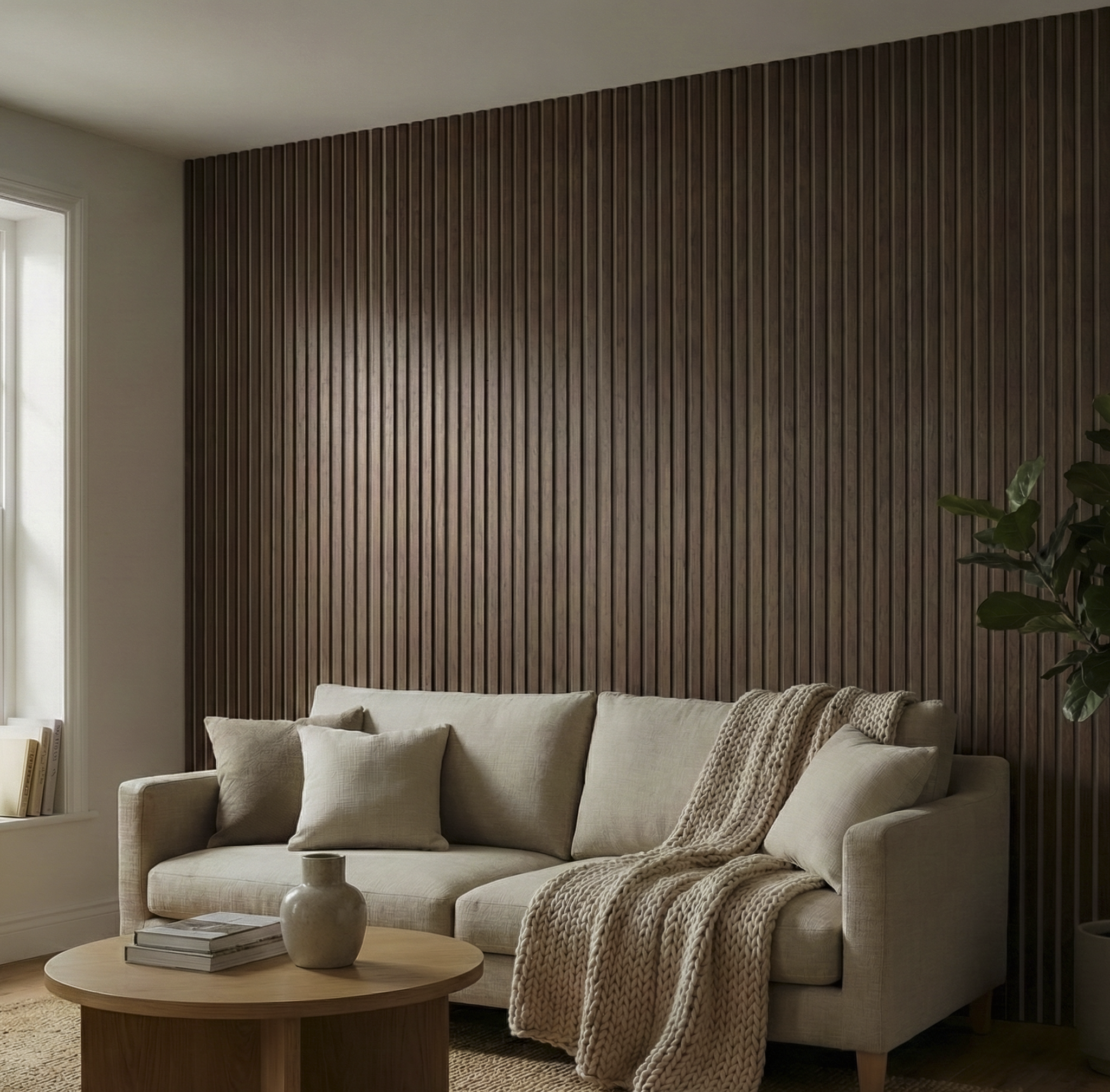 Transform your space effortlessly with our stunning Decorative Slatwall Panels. Enhance your space with a Deep Walnut finish and a cosy black felt backing, these panels will completely redefine your interior. More than just looks, these panels play a dual role—decor with acoustic properties – making your house both feel and sound like a home. Sourced in the UK, our panels boast unmatched grain consistency and colour. Elevate your space affordably with our panels – where style meets value seamlessly.